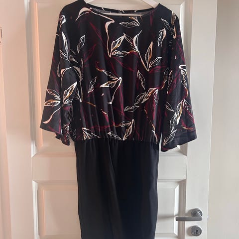 b.young hverdagskjole for dame i str. 40. Kjolen er flerfarget med mønstret stoff og er laget i polyester. Den har lange ermer og løs passform med voluminert skjørt. Ytterstoffet er lett og transparent med et underkjolestoff som gjør kjolen ikke-gjennomsiktig. Egnet som hverdagskjole eller til enkle anledninger.