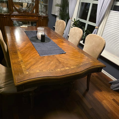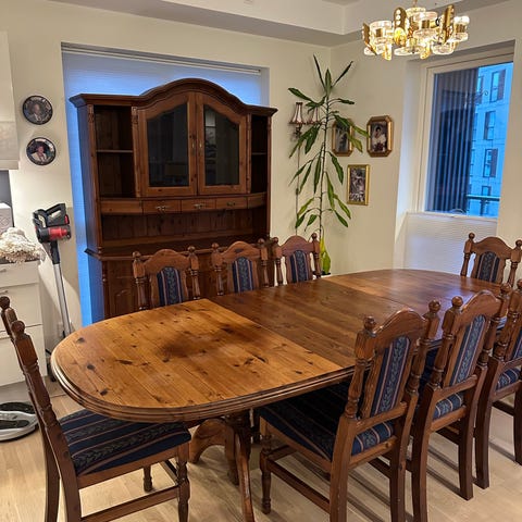 Spisestue m/10 stoler: 1,35 langt,2 stk a,50 cm plater så kan bli 2,35 langt ,tilhørende skjenk og halv høyt skap, samlet kr 5000,el,3000 for spisestue, 1000 for skjenk,1000 for skap