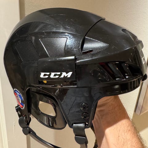 CCM FM50 ishockeyhjelm med gitter str M. Hodeomkrets 54,5-59 cm (uten lue 🙂). Lett å justere størrelsen. Passer barn i vekst.