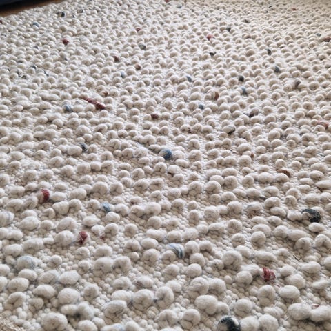 Teppet er laget av ull, noe som gjør det slitesterkt, naturlig og behagelig å gå på. Fremstår i veldig god stand og er lite brukt (1 uka)