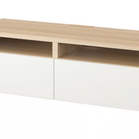 IKEA Bestå TV-benk med tv-feste. TV-benken har fronter i eikefiner med fiskebeinsmønster. Det følger med feste for TV, som kan monteres på benken. Perfekt for leietakere som ikke kan skru hull i veggen!