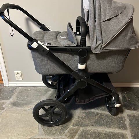 Bugaboo fox 3 barnevogn med liggedel i grå tekstil. Vognen har justerbart håndtak, stor kalesje og romslig varekurv under. Liggedelen har madrass og trekk i matchende gråfarge. Passer til bruk fra nyfødt og er egnet for både by- og turbruk på variert underlag.