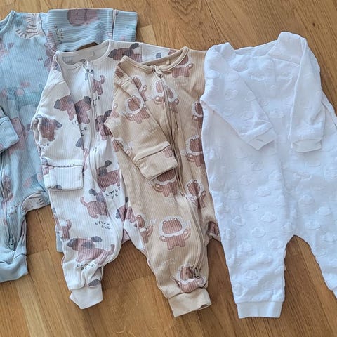 Plaggene har ulike mønstre og striper i nøytrale farger, noen med dyremotiv. Klærne passer til nyfødt og små babyer, og er egnet til hverdagsbruk og som basisplagg i garderoben.