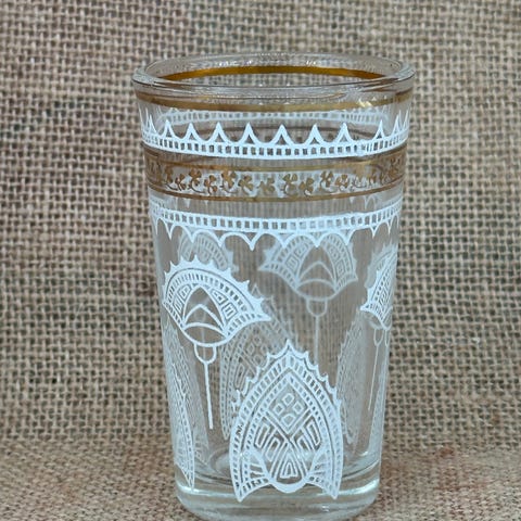 7 teglass, egnet for marokkansk myntete, i ulike farger og mønster selges. Glassene rommer 200 ml og er ca. 10 cm høye. Jeg har brukt dem som lyslykter og ikke som teglass. Glassene koster ca. 100 kr nypris og jeg selger dem samlet for 250 kr. Må hentes i Trondheim.