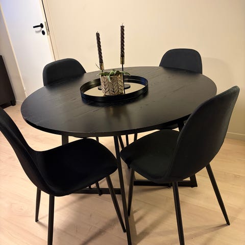 Sagene rundt spisebord Ø130 H75.5 cm lakkert askefiner svart inkludert 2 ileggsplater med ben heltre