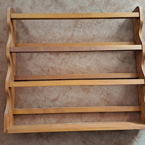 Søt tallerkenhylle til salgs. Noen mindre bruksspor, men i god stand. Har brukt den som bokhylle på barnerom, men er selvfølgelig vel så fin til det opprinnelige formålet.