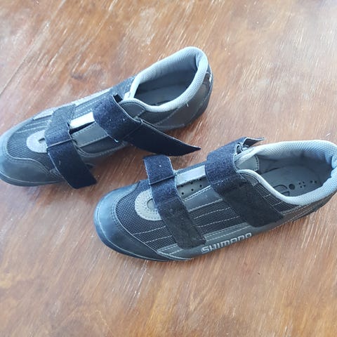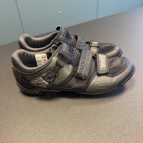 Shimano sykkelsko i størrelse 44 for SPD/klikkpedaler. Passer til terreng, tursykling eller spinning. Merk avskrapning på høyre hæl i ytterstoff.