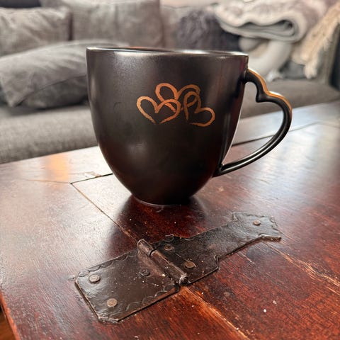 Magnor Glassverk Love is Love kopp og bolle i svart porselen/keramikk med gullfargede detaljer. Serviset består av kopper med hank og tilhørende boller. Dekor med hjerter og teksten «Love is love» på innsiden av bollene. Egnet til servering av varme og kalde drikker samt frokost, dessert eller snacks. Nøytralt, mørkt design som passer inn i de fleste borddekkinger.