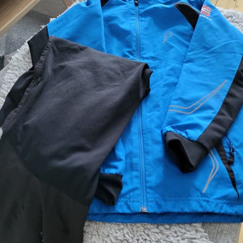 Sett med jakke og bukse i blå og svart farge med refleksdetaljer og klubb-/sponsorlogoer. Jakken har hel glidelås foran, lommer med glidelås og strikker på innsiden som kan strammes nederst. Buksen har strikk og snøring i livet, glidelås nederst på beina og paneler i kontrastfarge. I tillegg til kvalitets klubbtøy er dette egnet som trenings- eller overtrekksdress til ulike uteaktiviteter. Kan kjøpes nytt på Bull ski og kajakk eller svært lite og pent brukt her.