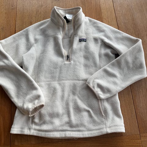 Patagonia fleecegenser for jente i størrelse M/ ca. 146. Genseren er i oransje fleece med lyse kontrastdetaljer på krage, mansjetter og brystlomme. Halv glidelås i front og brystlomme med glidelås. Mykt fleecemateriale som egner seg godt til hverdagsbruk og som mellomlag på kjølige dager.