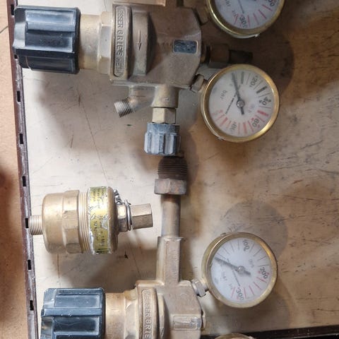 Hydro gassregulator med doble manometre. Regulatoren har justeringshjul i plast og tilkoblinger for slange og rør. Egnet for regulering av gasstrykk