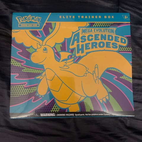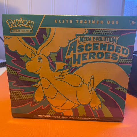 Pokémon Mega Evolution Ascended Heroes Elite Trainer Box kortspillsett. Inneholder samlekort og tilbehør til Pokémon Trading Card Game, inkludert boosterpakkar, kortbeskyttere, terninger, markører og oppbevaringsboks med motiv fra Mega Evolution Ascended Heroes-serien. Egnet for bruk sammen med andre Pokémon TCG-produkter.