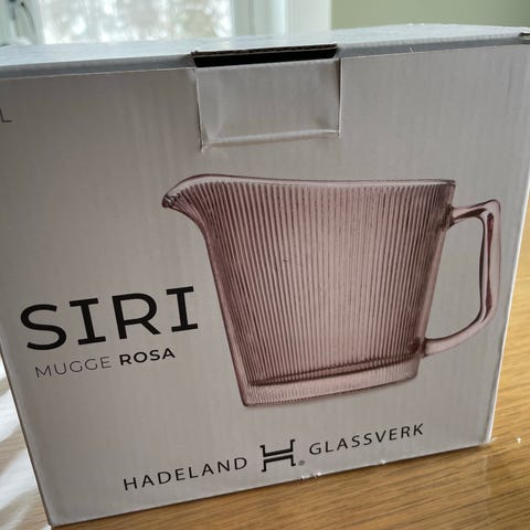 Mugge fra Hadeland Glassverk i klart glass med grønn kant øverst. Muggen har helletut og hank for enkel servering. Egner seg til servering av vann, saft eller andre kalde drikker ved borddekking og hverdagsbruk. Kan også brukes som vase til sommerlige buketter. Rommer 2 liter. Kan hentes på Rødtvet.