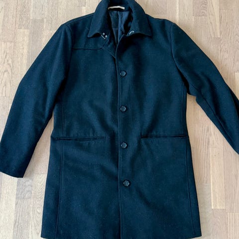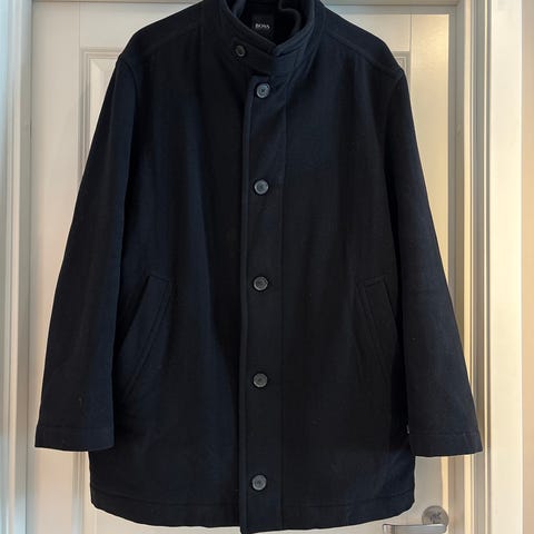 Hugo Boss ulljakke for herre i størrelse XL. Jakken er svart og laget i ullmateriale, med knappelukking foran. Den har høy krage og skråstilte lommer i sidene. Passer som ytterjakke i kjøligere vær. Designet er enkelt og klassisk, egnet til både hverdagsbruk og mer formelle anledninger.