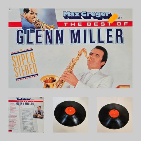Samling med 6 LP-plater med jazz, swing og beslektet musikk. Blant platene som kan identifiseres på bildene er utgivelser relatert til Glenn Miller, Max Greger, samt andre swing- og schlagerinnspillinger. Platene er i standard LP-format (12-tommers vinyl). Egner seg for samlere eller for de som ønsker et utvalg eldre jazz- og swingmusikk på vinyl.