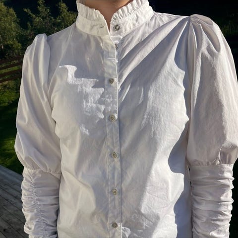 Co’couture skjorte for dame i størrelse M. Skjorten er hvit og laget av bomull. Den har klassisk krage, lange ermer med mansjetter og knappelukking foran. På brystet er det en påsydd lomme. Passer til hverdagsbruk og mer formelle anledninger, og kan brukes både alene og under jakker eller gensere. Det er 100% cotton