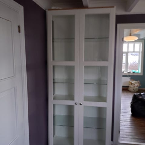 Selger et enkeltstående hvitt høyskap. Skapet har front med glassplate, fremstår i praksis som såkalt høyglans-skap. Skapet er som nytt med unntak av en tynn strek/skrape i glasset som jeg ikke har klart å få bort. Innvendige hyller er ikke med på bildet, men er inkludert. Står nå oppbevart i tørr garasje.
