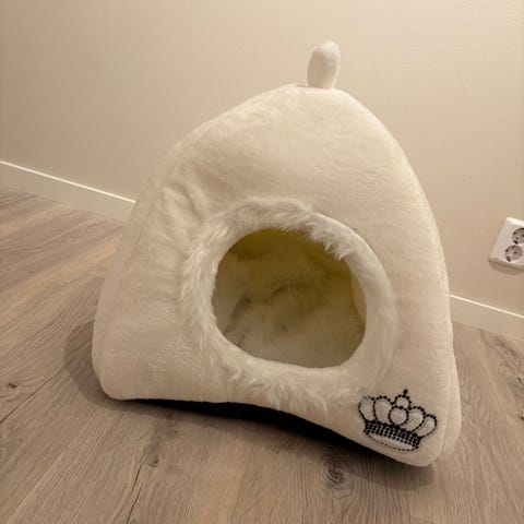 Kattehus i huleform laget i myk, hvit plysj. Åpning i front med løs, fluffy pute inni. Undersiden er i gummiert materiale. Egnet som liggeplass og soveplass for katt eller liten hund som ønsker et lunt og skjermet sted å hvile. Den firbeinte sjefen i huset viste seg dessverre ikke å være særlig fan av trange rom, så den har aldri vært brukt.