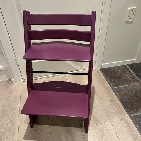 Stokke Tripp Trapp høy barnestol i tre, i rosa farge. Stolen har justerbart sete og fotbrett som kan tilpasses barnets høyde. Klassisk Tripp Trapp-konstruksjon som står støtt på gulvet og kan skyves inntil bordkant.