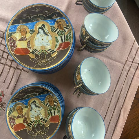 Aarikka tekanne- og kaffeservise i porselen. Serviset består av tekanne, sukkerskål, melkekanne og kopper med tilhørende asjetter. Delene har flerfarget dekor med figurmotiver på mørk bunn og er merket «Made in Japan» under. Egner seg til servering av kaffe eller te og som dekorativt servise i kjøkken eller spisestue.