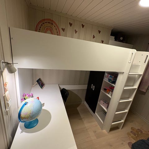 Loftseng med garderobe og pult. Sengen er hvit, med sort tavle på dører og skuffer. Noen bruksmerker, men ellers fin. Madrass medfølger ikke. Må hentes.