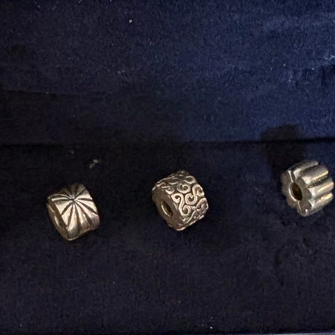 9 stk Pandora charm I oxydert sølv, to med heng.