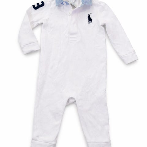 Polo Ralph Lauren heldress / sparkedress for baby i størrelse 9 måneder. Brukt kun noen fåtall ganger. Heldressen er unisex og laget av bomull i mørk blå farge. Modellen har lange ermer, krage og knepping foran som på en poloskjorte. Det er ribbekanter ved ermer og ben, samt trykknapper mellom bena for enkel av- og påkledning. Rød logo på brystet og rød tallapplikasjon på ermet. Passer til hverdagsbruk og som behagelig plagg for små barn.