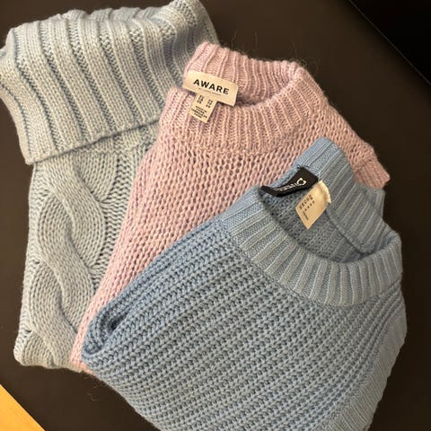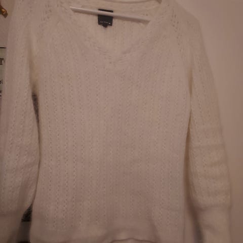 Ane Mone genser for dame i størrelse M. Genseren er blå og strikket i 100 % bomull. Den har hullstrikket mønster, rund hals og ribbekanter. Nederst på genseren er det en volangkant. Egner seg som en lett genser til hverdagsbruk.