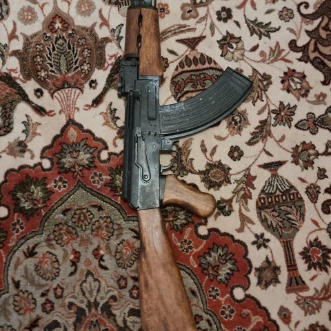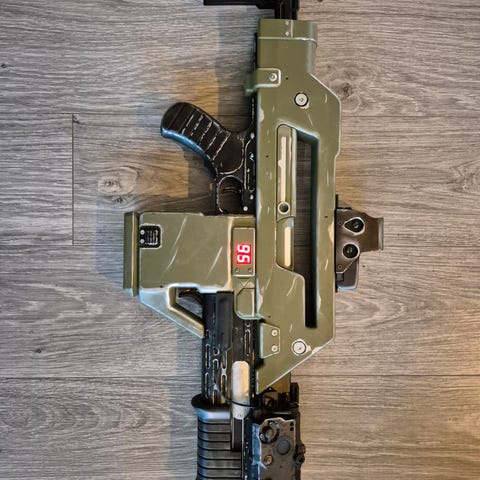 Lekevåpen i form av en uzi i svart farge med bærestropp. Modellen har detaljer som etterligner en maskinpistol, med håndtak, avtrekker og løp i plast. Lengden fremgår av bilde med målebånd. Egnet som rekvisitt eller leke der dette er tillatt, og bør brukes under oppsyn av voksne og i tråd med gjeldende lover og regler for lekevåpen og våpenkopier.