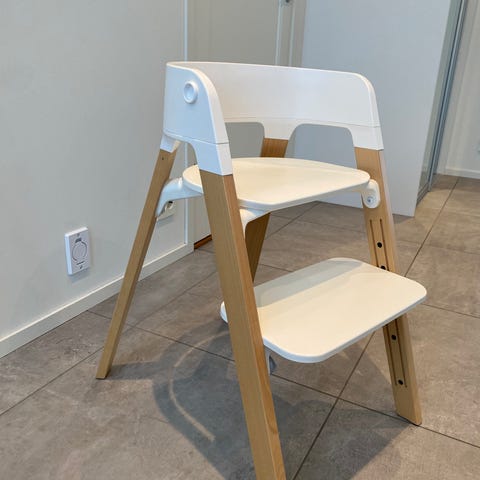 Stokke høy barnestol i hvit plast med ben i tre. Stolen har sete og fotbrett i hvit plast, samt skrå ben i lyst treverk for stabilitet.