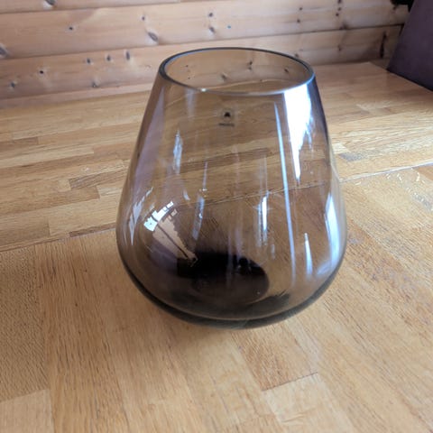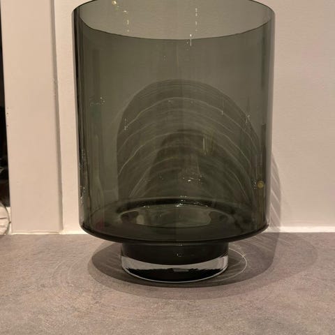Magnor Glassverk Halvor Bakke. Rocks lykt/vase, den største på 28 cm i koksgrå. Vasen har ikke stempel under, men er kjøpt hos Magnor fabrikkutsalg.