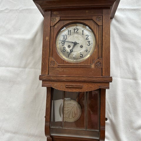 Veggur med pendel i rektangulær ramme av treverk. Klokken har stor, rund urskive med romertall og dekorert midtparti. Nederste del av fronten har glassfelt med motiv av jente og ornamentale detaljer rundt. Klokken er laget for veggmontering og passer som innredningselement i stue, gang eller andre oppholdsrom der man ønsker et dekorativt veggur.