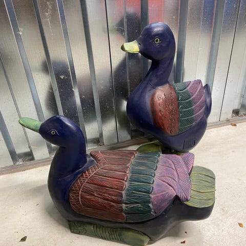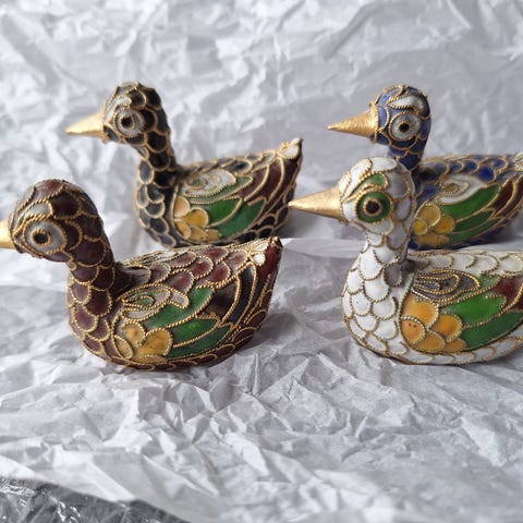 Endene måler 7 cm fra nebb til hale spiss . Er kjøpt i Hongkong på 90-tallet. Flokken har ikke lyst å bli skilt fra hverandre.