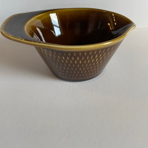 Sausenebb til Kon Tiki serien fra Stavangerflint. Ronmmer ca. 0,4 liter, skål D: 15,5 cm. Design Inger Eaage og Kåre Berven Fjeldsaa. Selges samlet Kr. 500,-