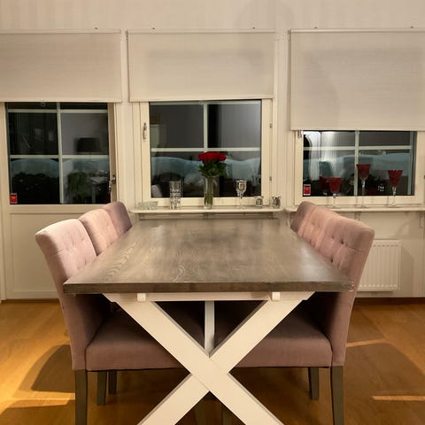Flott grålakkert spisestue for inntil 10 personer inkl. bord m/ ileggsplater, liten og stor skjenk og glass-skap. Inkl. 8 stk. stoler i rotting. Med "god vilje" kan man sitte 12 stk. rundt bordet