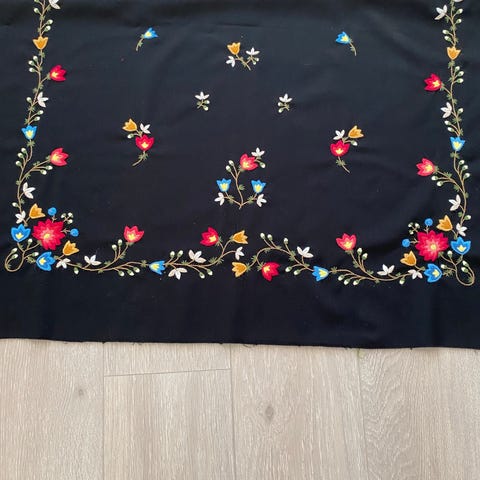 * Farge: Svart med flerfargede broderier og rødt fôr