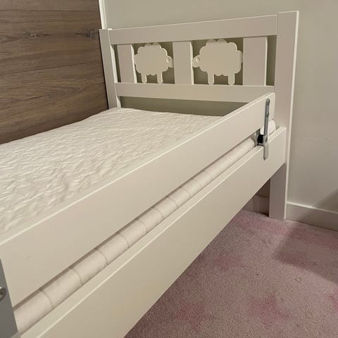 IKEA Lurøy juniorseng med ribbebunn. Sengen har hvit ramme og ribbebunn i tre. Egnet som overgangsseng mellom sprinkelseng og vanlig seng for barn. Ribbebunnen gir støtte til madrassen og god lufting. Passer standard madrass til juniorseng (mål ikke oppgitt).