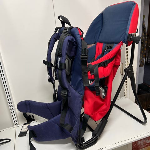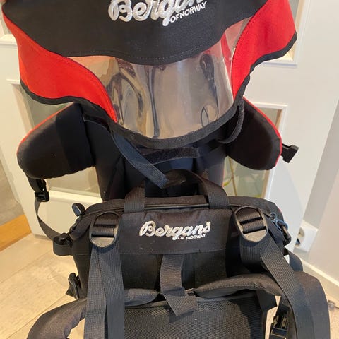 Bergans bæremeis for barn i rød og grå farge. Bæremeisen har polstret rygg og skulderstropper, samt hoftebelte for bedre vektfordeling. Justerbare stropper gir mulighet for tilpasning til bærer. Integrert støttebøyle gjør at bæremeisen kan stå støtt på bakken ved inn- og utlasting av barnet. Egnet til tur og hverdagsbruk der barnet bæres på ryggen.