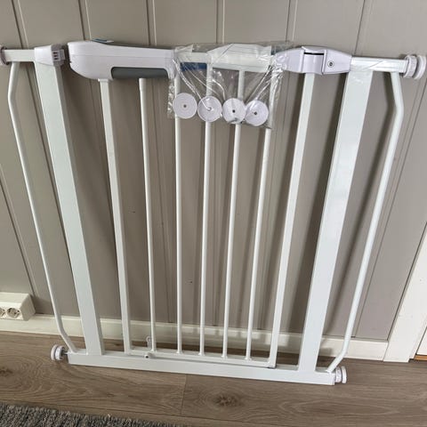 BabyDan sikkerhetsgrind i hvitlakkert metall. Grindene festes i vegg med medfølgende veggfester og justerbare skruer. Egner seg til sikring av åpninger, for eksempel dører eller trapper, for små barn. Kan tas av og på veggfestene ved behov. Passer innendørs bruk i hjemmemiljø. Eksakt bredde og høyde er ikke oppgitt og måles ved behov.