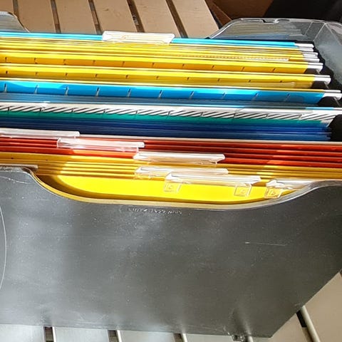 Sett med oppbevaringsbokser i papp og plast i ulike størrelser og farger. Pappboksene har lokk og metallbeslag i hjørner og håndtak i front, egnet for lagring av dokumenter, papirer eller annet smått. Plastboksene er gjennomskinnelige i blå og gul farge med lokk, egnet til oppbevaring av leker, hobbyutstyr eller annet innhold. Boksene kan stables for plassbesparende lagring i skap, på kontor eller andre rom.
