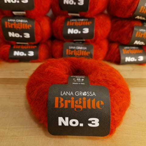 Lana Grossa Brigitte No. 3 garn i gulbeige farge. Garnet er luftig og pusete, egnet til strikking og hekling av blant annet gensere, jakker, sjal og tilbehør. Passer til prosjekter der man ønsker et mykt og lett uttrykk.