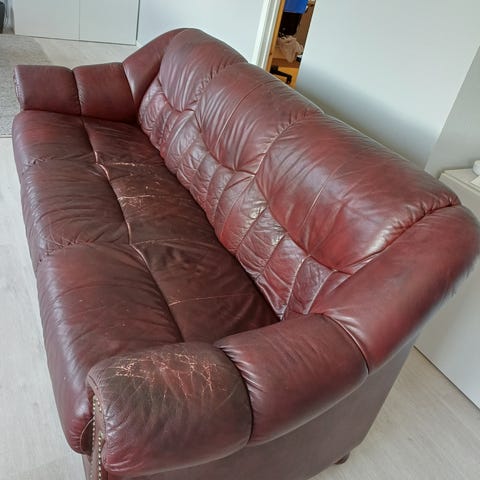 Selger 2 stk klassiske lenestoler i ekte skinn (burgunder/mørk rødbrun farge), Chesterfield lignende. Stolene ble kjøpt for ca. 30 år siden hos Bjørnsen på Bryne (nå Møbelringen).