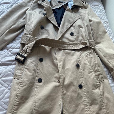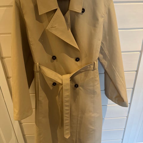 Mango trenchcoat for dame i størrelse M. Den er beige og laget i imitert skinn . Modellen har belte i livet, dobbeltspent knepping og skulder- og ermedetaljer. Lengden går omtrent til over kneet, og jakken har klassiske detaljer som passer til bruk i overgangssesonger og milde dager.