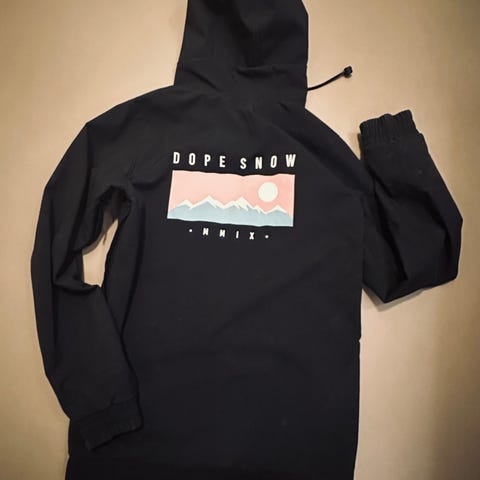 Dope Snow anorakk jakke for herre i størrelse S. Jakken har svart front og rygg med olivengrønne ermer og Dope Snow-logo på ermet. Innsiden er fôret med mykt fleece-materiale for ekstra komfort og varme. Modellen har hette med snøring, stor kengurulomme med klaff foran og ribbestrikket kant nederst. Egner seg til bruk i kjøligere vær og til ulike utendørsaktiviteter.