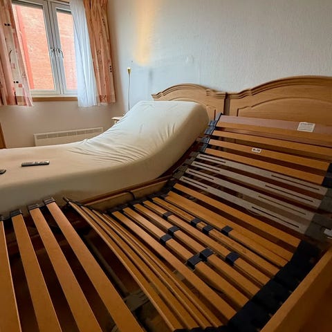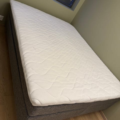 Meget lite brukt. Kan justeres i begge endene med fjernkontroll. 90 cm bred inklusiv nesten ny overmadrass som er vaskbar.