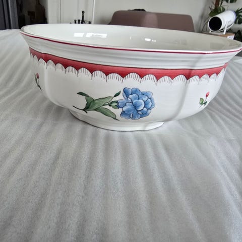 Villeroy & Boch Jardin d’Alsace Fleur, Selger 2 serveringsfat, nesten ubrukt, 36,5 cm langt, 27 cm bredt, .500 pr stk., serveringsfat i vitro-porselen. Ovalt fat med bølget kant og flerfarget blomsterdekor samt rød kantlinje. Fatet egner seg til servering av for eksempel kjøtt, fisk, grønnsaker eller kaker. Ifølge baksidestempelet er fatet oppvaskmaskinsikkert og kan brukes i mikrobølgeovn.