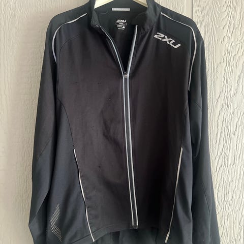 2XU løpejakke for herre i størrelse L. Jakken er svart og har hette. Den har hel glidelås i front og glidelåslomme på brystet. Refleksdetaljer foran og bak gir bedre synlighet i mørket. Egnet som ytterlag til løping og annen trening utendørs.