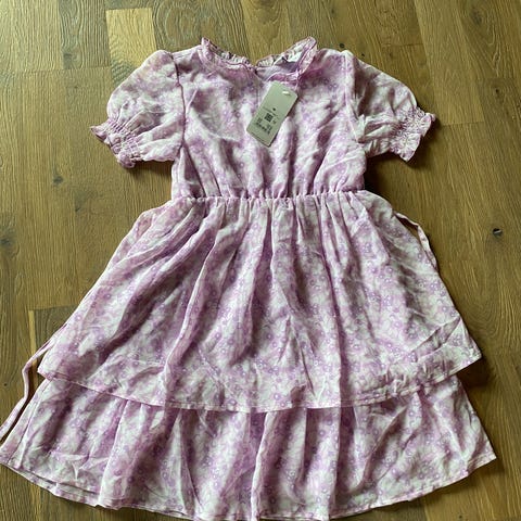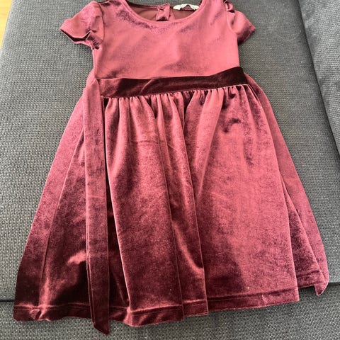 Cubus kjole for jente i størrelse 110/116. Kjolen er burgunder rød og laget i polyester med fløyelsaktig overflate. Den har korte ermer, rund hals og knapper bak. I ryggen er det knapper hele veien ned til midjen, samt et belte i samme stoff som knytes rundt livet. Skjørtet er utsvingt med god vidde. Passer til bruk for jente i ca. størrelse 110/116, til både hverdag og mer pyntede anledninger.