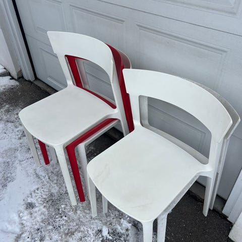Gis bort samlet. Se bilder for slitasje. Vi har brukt disse som ekstrastoler, siden de er nokså slitte.