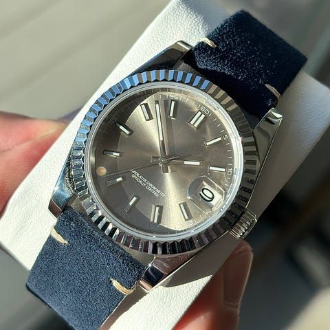 Dette er en nylig ferdigstilt, spesialbygd klokke, satt sammen av meg med fokus på presisjon. Klokken er bygget med høykvalitets tredjeparts komponenter og et originalt Seiko-urverk for å sikre best mulig finish og holdbarhet. Klokken er inspirert av det klassiske Datejust/Oyster Perpetual-designet – en stil som er ekstremt ettertraktet i 2026 – men skiller seg ut med en fantastisk sunburst-skive og en eksklusiv detalj på baksiden.